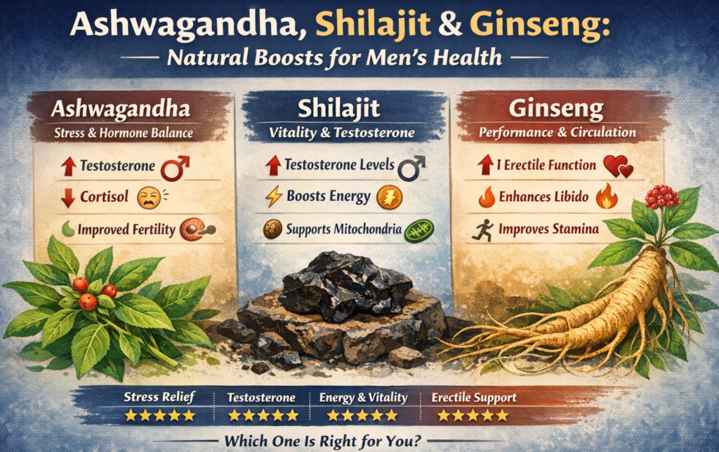 In the real world, these ingredients rarely work in isolation. Many high-quality supplements combine these herbs to target different pathways simultaneously. For example, a formula might include Ashwagandha for stress reduction and testosterone support, Ginseng for acute blood flow, and Shilajit for cellular energy and nutrient delivery .